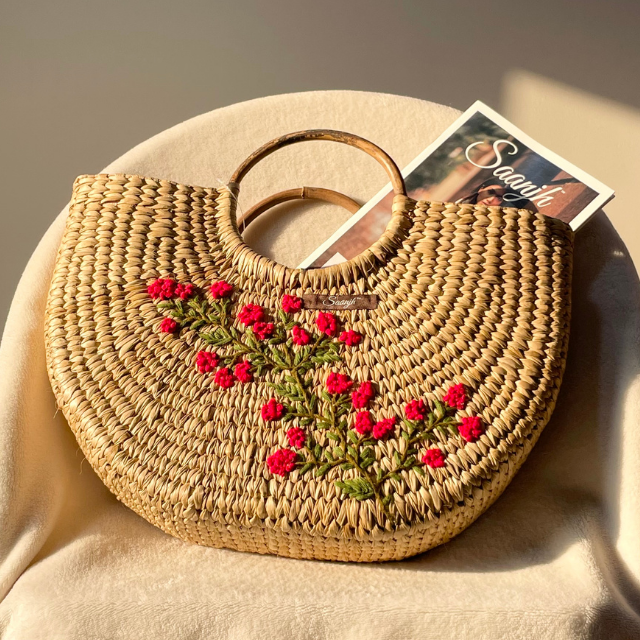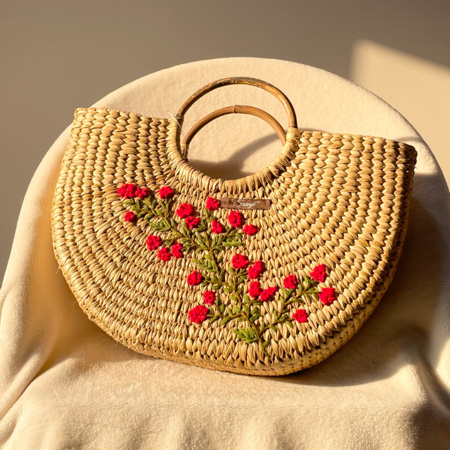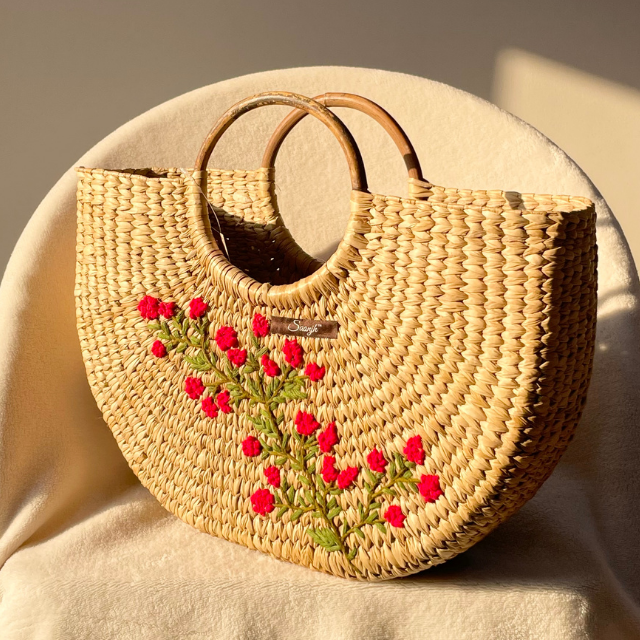 Un sac panier tout usage est tissé à la main avec de l'herbe Kauna. Ce sac est idéal pour emporter vos vacances ainsi que vos brunchs. L'intérieur dispose d'un espace de rangement volumineux pour vos essentiels.