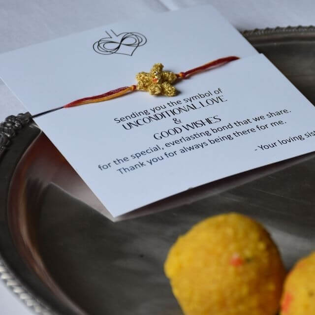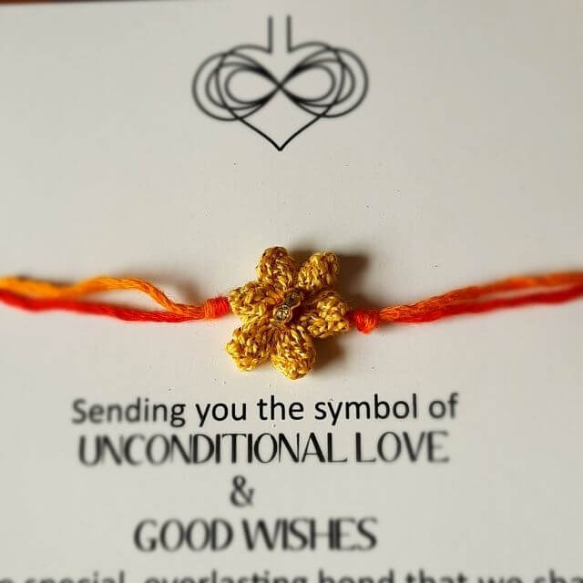 The Rakhi has a a beautifully knotted thread center in yellow with a traditional raksha kalava or dhaga on both sides.